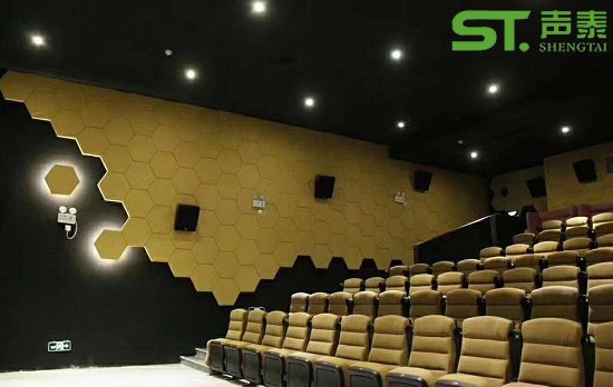 銀幕后墻:銀幕后墻一般做強(qiáng)吸聲處理,以消除后墻反射聲多直達(dá)聲的干擾。同時(shí)也減少這一空間的混響而提高語(yǔ)音清晰度,對(duì)多聲道立體聲則更有利于聲像定位。建議采用聲泰25mm-50mm布藝吸聲軟包,影院天花采用聲泰50mm黑色玻纖吸聲板,平均吸聲系數(shù)為0.9a